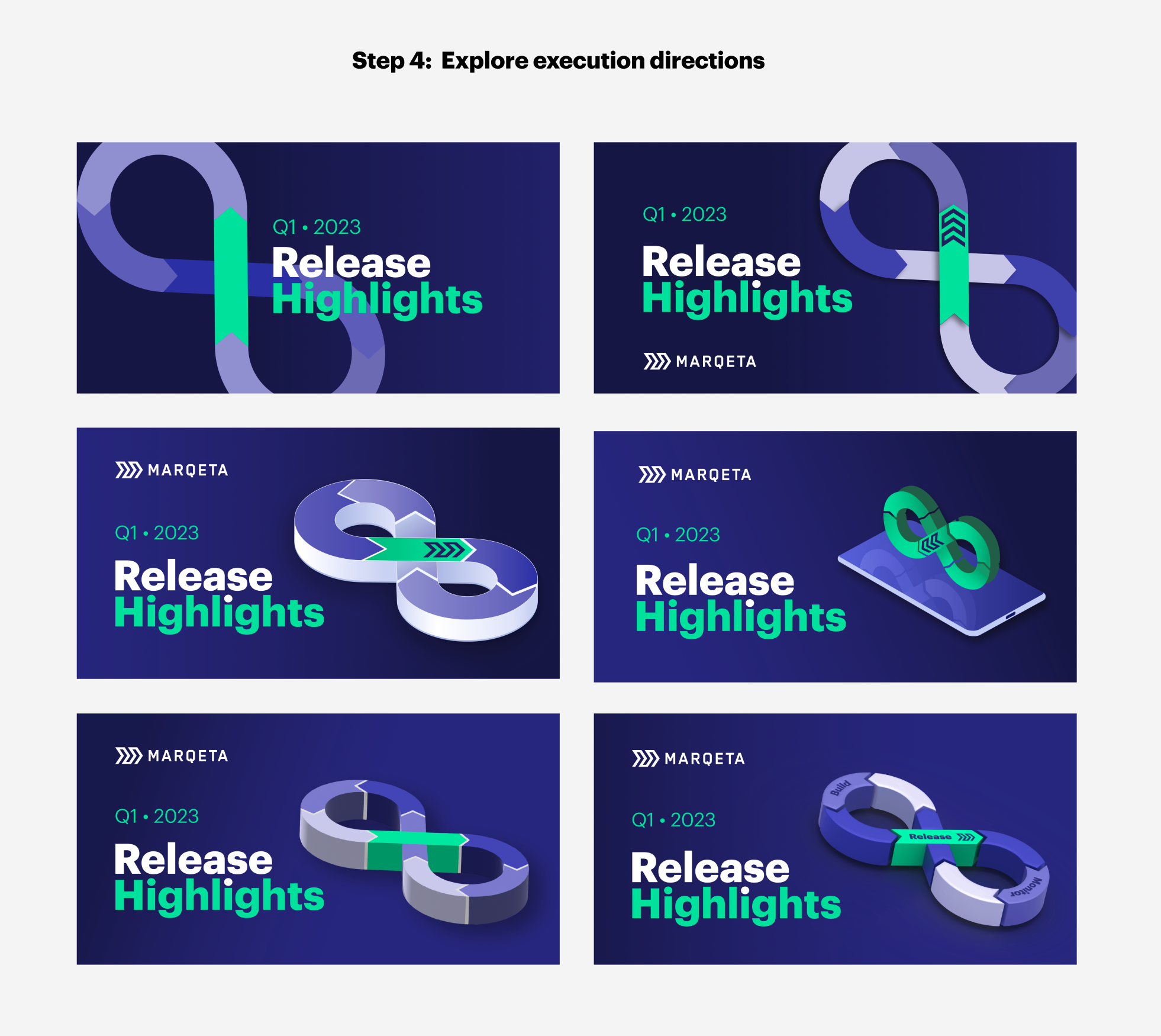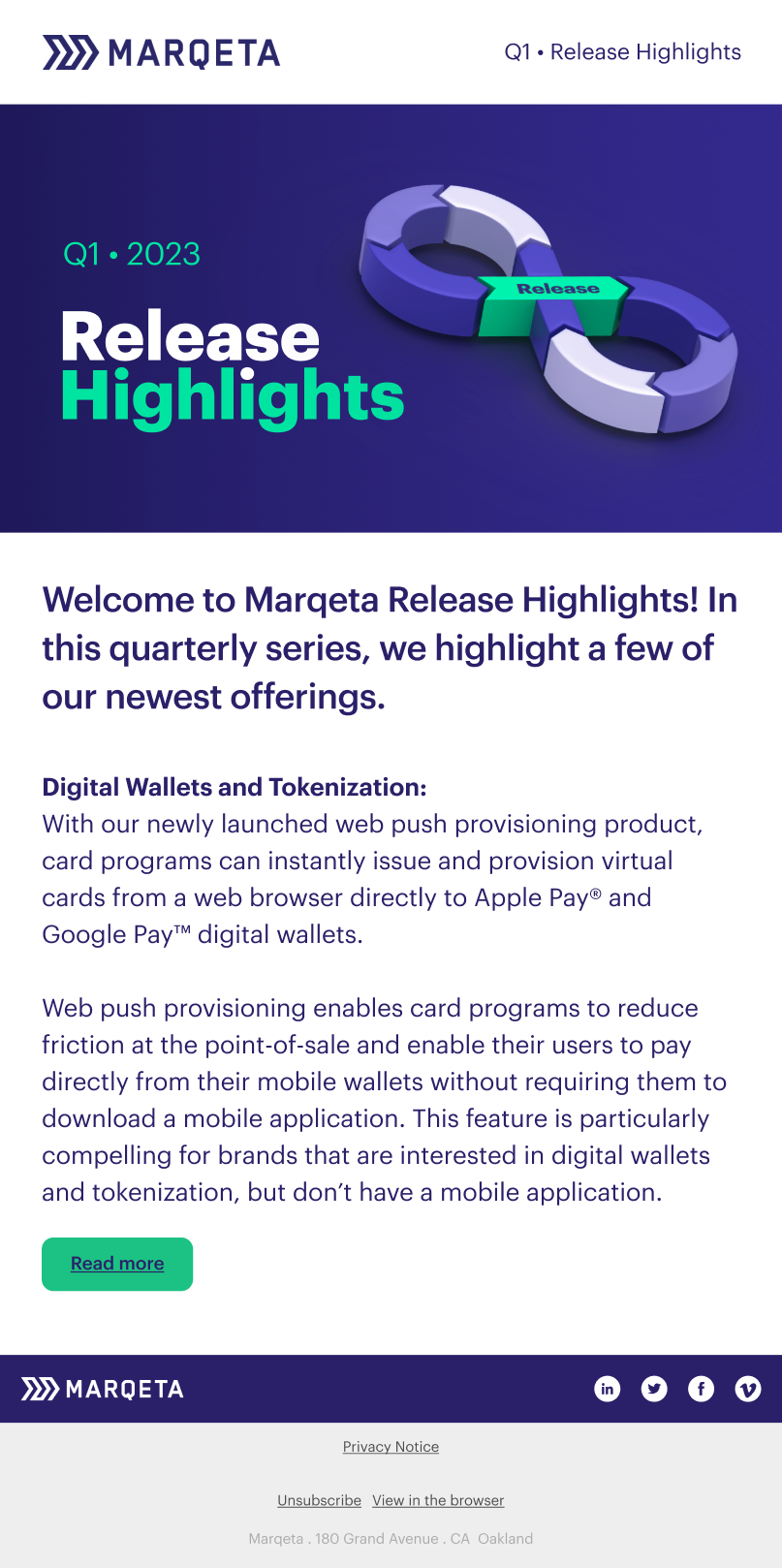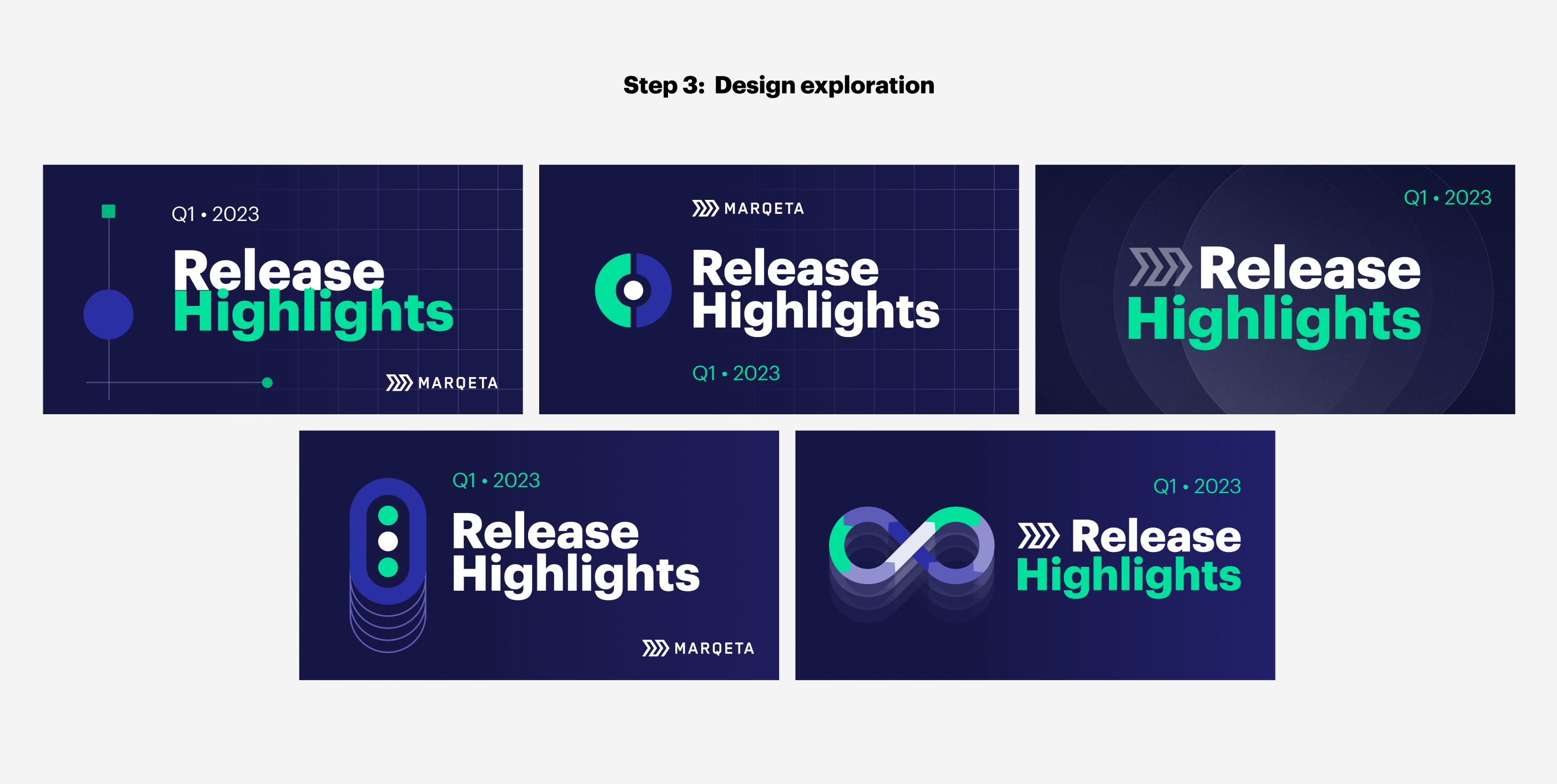 Marqeta is a fintech platform that requested a sub-brand be created to promote product release highlights as a way to connect more frequently with tech developers. This quarterly marketing release contains important updates to products and docs. The goal was to go beyond basic marketing content to increase visibility and adoption of new features.