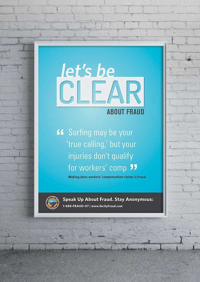 This print campaign re-conceptualized the anti-fraud messaging for the Long Beach City Auditor’s office by infusing a lighter tone to the message and visuals. This ‘Clarifying Fraud’ integrated campaign was selected as the winner out of three entries in a design competition and it was implemented city-wide. I art directed the “Let’s Be Clear” logotype, to be the staple message of the campaign. I co-wrote the quotes about types of fraud. I finalized the production and final printing of all assets.