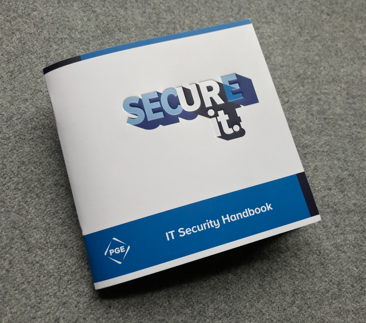 This handbook was designed for the IT Department of Portland General Electric as part of the SECURE it. campaign to educate employees on best practices in cybersecurity. Design finishing techniques include a deboss on the front cover to accentuate the white-on-white logotype.