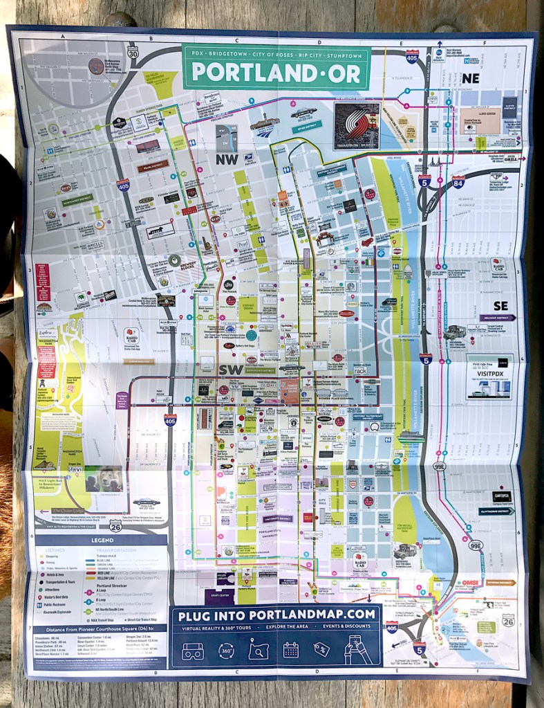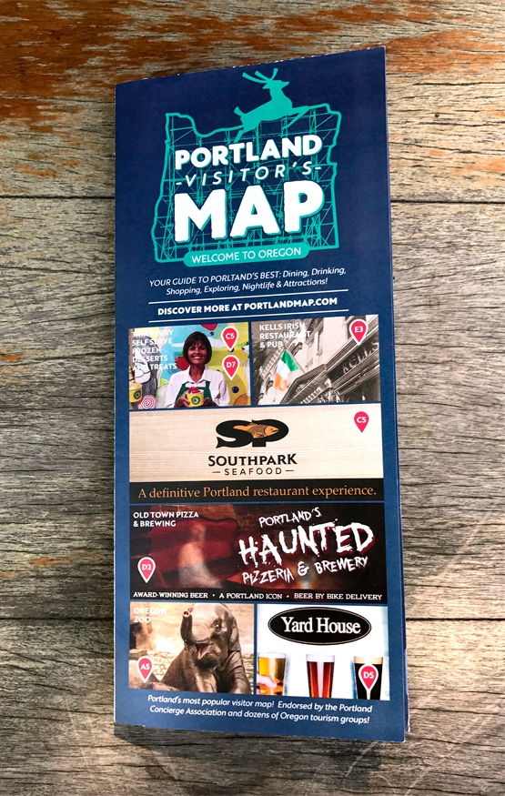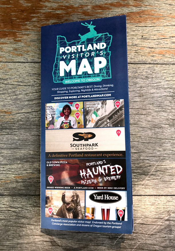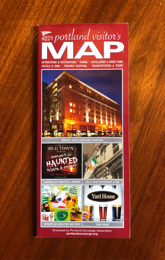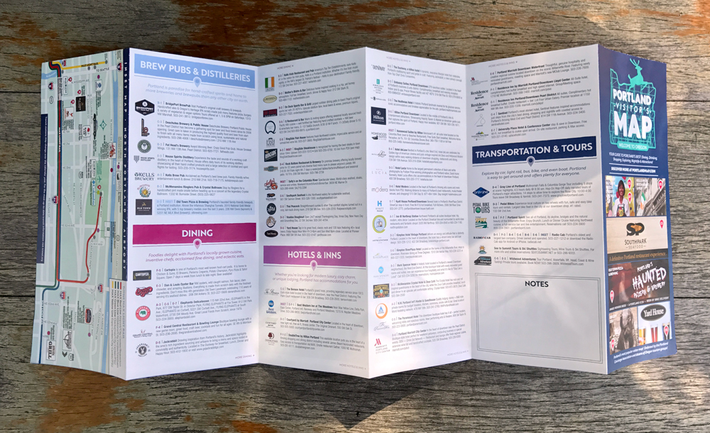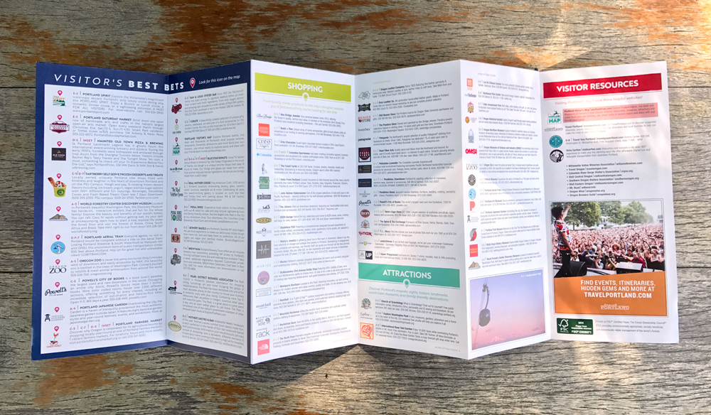 This accordion fold map was re-designed to update the long-standing Portland Visitor’s Map. I rebranded with a new logotype inspired by the White Stag sign on Burnside, along with fresh brand colors inspired by the iconic PDX airport carpet, as well as a new fonts and graphic elements to completely change the look and feel of the outdated brochure/map.